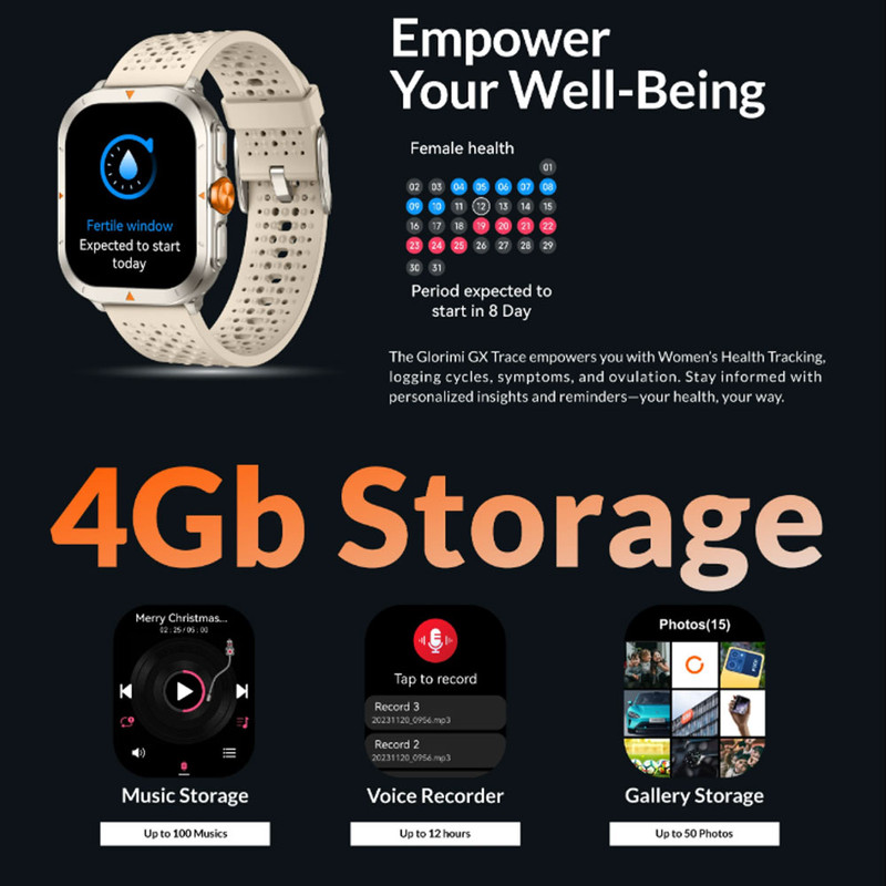 GX TRACE با سیستمعامل اختصاصی Glorimi ارائهشده که از زبان فارسی هم در منو و اعلانها پشتیبانی میکند. قابلیت مکالمه از طریق بلوتوث، کنترل موسیقی، پخش آفلاین و پشتیبانی از فناوری TWS برای اتصال به هدفون، آن را به دستگاهی چندکاره تبدیل کرده است. همچنین با حافظه داخلی ۴ گیگابایتی، امکان ذخیرهسازی صدها آهنگ، عکس و فایل صوتی را فراهم میسازد.