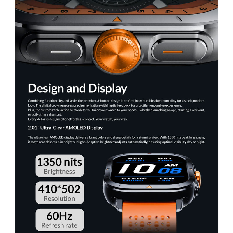 ساعت هوشمند Glorimi GX TRACE با بدنهای از آلیاژ روی، صفحهنمایش ۲.۰۱ اینچی AMOLED و روشنایی ۱۳۵۰ نیت، تصویری شفاف و پرنور را در هر شرایط نوری فراهم میکند. فرم مربع قاب، همراه با بند سیلیکونی، جلوهای اسپرت و مدرن به آن میبخشد.