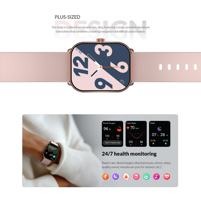 توضیحات جنس بدنه : شیشه مقاوم 2.5D با سختی بالا / فریم مقاوم از جنس پلی‌کربنات (PC Frame) / دکمه ساخته‌شده از استیل ضدزنگ 304L برای دوام بیشتر / دکمه چرخان (Rotating Crown Button) برای کنترل آسان‌تر عملکردها